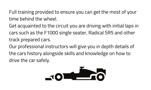 1:1 Trackday in our Radical SR5 or Ariel Atom 300 car at the circuit you will be driving, on the Grand Prix circuit. Pit garage, breakfast and lunch included.